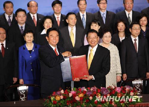 海協(xié)會會長陳云林(前左)與?;鶗麻L江丙坤在交換協(xié)議。新華社記者 袁滿攝